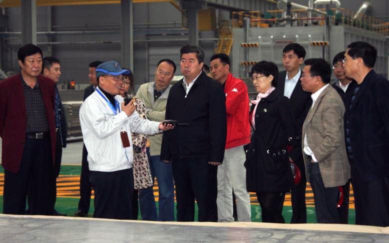 在我司一期投產(chǎn)的大規(guī)格鋁強化板拉伸車間,楊董事長向旅順口區(qū)政協(xié)常委們詳細的介紹了公司目前主體項目的發(fā)展狀況、科技水平的領先程度、市場預測以及未來的發(fā)展前景等,并陪同常委們一行參觀了生產(chǎn)一線。