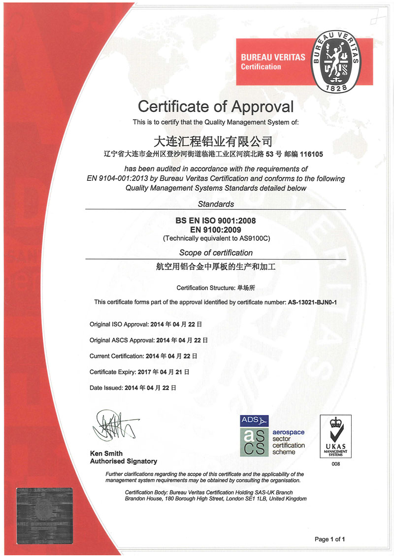 2014-05-122014年5月12日,大連匯程鋁業(yè)有限公司獲得了法國BV認(rèn)證公司頒發(fā)的AS9100C質(zhì)量管理體系認(rèn)證證書。AS9100C認(rèn)證證書的獲得,將為我司規(guī)范管理、開拓市場、成為國內(nèi)外各大航空公司供應(yīng)商奠定了堅實的基礎(chǔ)。
