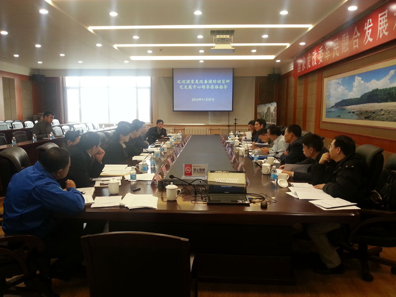 2014-11-28 2014年11月27日上午,國家發(fā)改委國防動員研究發(fā)展中心主任畢智勇、副主任傅桃生等一行5人,在省發(fā)改委經濟動員辦調研員陰炎、市發(fā)改委副巡視員郭鳳迎、動員處副處長石曉武等陪同下,來我司進行考察,并在登沙河產業(yè)區(qū)管委會三樓會議室召開“軍民融合發(fā)展示范區(qū)座談會”。我司董事長楊曉光熱情的接待了國家發(fā)改委一行,并在座談會上與國家發(fā)改委領導進行了親切的交流。